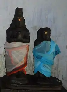 In the next stage of his life, Sundarar moved around Tamil Nadu, visiting Shiva Temples of Tamil Nadu. In Tiruvarur, he fell in love with a temple dancer named Paravayar, and married her.[3] After few years of married life, Sundarar visits the Siva temple in Thiruvottriyur, a sea-side suburb of Madras. There he meets and is enamoured by a peasant Vellala girl Cankali.[5] With the help of Shiva, this leads to Sundarar's second marriage, but only after his wedding vows include the promise of never leaving Cankali and Thiruvottriyur.[7] After marrying his second wife, Sundarar misses his first wife Paravai. He does not keep his word, and leaves for Tiruvarur. The broken vow causes him to go blind before he reaches Tiruvarur. His suffering thereafter are part of several Tevaram hymns.[12] As a blind man, he visits many Shiva shrines and sings there. Slowly in stages, he becomes closer to Shiva and recovers his sight.[13]