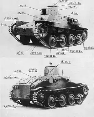 Over twice as large as the Type 94 at (7.4 tonnes), the Type 95 Ha-Go light tank had a complement of three crewmen, a 37 mm gun and the same 6.5 mm type 91 machine gun, and most importantly a diesel engine which would later greatly influence future tank designs in the Soviet Army.[15][16] Over two-thousand Type 95 tanks were built, and production continued until 1943.[17]