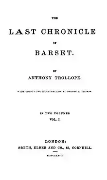 The Last Chronicle of Barset is a novel by English author Anthony Trollope, published in 1867. It is the sixth and final book in the Chronicles of Barsetshire series, preceded by The Small House at Allington. The novel is set in the fictional county of Barsetshire and deploys characters from the earlier novels, whilst concentrating on the personnel associated with the cathedral. The main narrative thread is catalysed by the loss of a cheque which had been in the possession of the Reverend Josiah Crawley, and the subsequent reactions of his friends and enemies. Trollope drew inspiration from his father and mother in the creation of the Rev. and Mrs. Crawley.[1] In his autobiography, Trollope regarded this novel as "the best novel I have written.",[2] although later commentators do not agree with this judgement.[3] The serialisation was illustrated by G H Thomas who was selected by the publisher, though Trollope had wished for Millais who had illustrated The Small House at Allington.[4]
