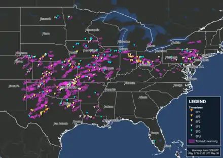 ![]() Map of tornado warnings and confirmed tornadoes from the outbreak | |