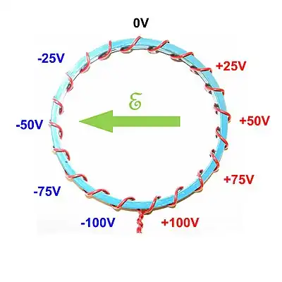 There will be a distribution of potential along the winding. This can lead to an E-Field in the plane of the toroid and also a susceptibility to an E field in the plane of the toroid, as shown in figure 7. This can be mitigated by using a return winding, as shown in Figure 8. With this winding, each place the winding crosses itself; the two parts will be at equal and opposite polarity, which substantially reduces the E field generated in the plane.