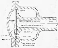 Train horns are operated by compressed air, typically 125-140 psi (8.6-9.6 bar), and fed from a locomotive main air reservoir. When the engineer opens the horn valve, air flows through a supply line into the power chamber at the horn's base (diagram, right). It passes through a narrow opening between a nozzle and a circular diaphragm in the power chamber, then out through the flaring horn bell. The flow of air past the diaphragm causes it to vibrate or oscillate against the nozzle, producing sound.