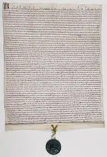 The Treaty of Paris, also known as Treaty of Meaux, was signed on 12 April 1229 between Raymond VII of Toulouse and Louis IX of France in Meaux near Paris. Louis was still a minor, and it was his mother Blanche of Castile, as regent, who was instrumental in forging the treaty.[1] The agreement officially ended the Albigensian Crusade, and according to the terms of the treaty, Raymond's daughter Joan was to be married to Louis' brother Alphonse.[2] Moreover, Raymond ceded the eastern provinces of his lands to Louis and the Marquisat de Provence to the Catholic church.[3] The treaty also gave the Inquisition absolute power regarding searching for, and seizing of, heretics.[4]