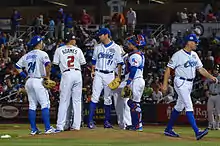 As a part of professional baseball's pace of play initiatives implemented in 2015, 20-second pitch clocks entered use at Triple-A stadiums in 2015.[23] In 2018, the time was shortened to 15 seconds when no runners are on base. Other significant changes implemented in 2018 included beginning extra innings with a runner on second base and limiting teams to six mound visits during a nine-inning game.[24] For the 2019 season, the number of mound visits was reduced to five, and pitchers were required to face a minimum of three consecutive batters unless the side is retired or the pitcher becomes injured and is unable to continue playing.[25]