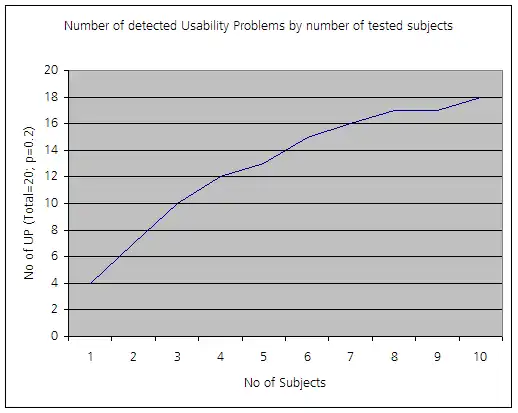 where p is the probability of one subject identifying a specific problem and n the number of subjects (or test sessions). This model shows up as an asymptotic graph towards the number of real existing problems (see figure below).