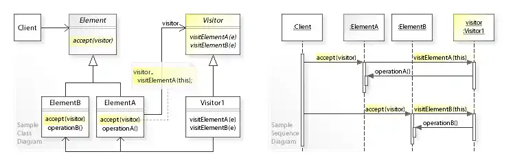 ElementB then implements accept(visitor) by dispatching to visitor.visitElementB(this). The Visitor1 class implements the operation (visitElementB(e:ElementB)).