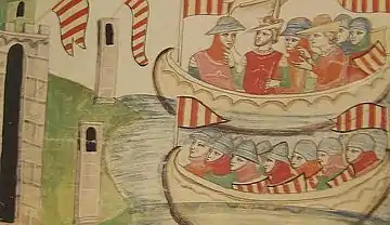 Peter III of Aragon disembarks at Trapani, a miniature from the Nuova Cronica of chronicler Giovanni Villani