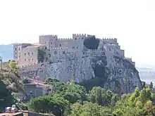 Rebels took control over most of the island, with only the key port city of Messina remaining under Angevin control. The home port of the Angevin crusader fleet, Messina was ringed with Angevin garrisons, was geographically close to Naples, and had benefited economically from Charles' aggressive shipbuilding program.[13] Inside the city, Angevin vicar Herbert of Orléans initially maintained control; however, as the rebellion grew in strength, unrest in the city grew. Hoping to bolster the city's defenses, in April Herbert sent Angevin troops to reinforce the mountain forts that circled Messina, but this action backfired and encouraged the increasingly pro-rebel populace; Fearing an imminent civil uprising, on 28 April Herbert and the Angevin garrison withdrew to the castle of Mategriffon, leaving the city to the rebels. Captain of the People Alaimo da Lentini took command of the city on behalf of the Sicilian rebels and rioters burned the Angevin crusader fleet stationed in the harbor, greatly hampering Charles' ambitions in the Mediterranean.[3][13]