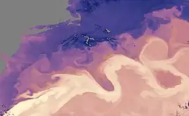 A warm core ring is a type of mesoscale eddy which forms and breaks off from an ocean current, such as the Gulf Stream or the Kuroshio Current. The ring is an independent circulatory system of warm water that can persist for several months before losing its distinctive identity.[1] Warm core rings can be detected using infrared satellites or sea height anomalies resulting from and are easily identifiable against the surrounding colder waters. In addition, warm core rings are also distinguished by their low levels of biological activity. This type of system is thought to have helped develop several hurricanes, most notably Hurricane Katrina, into significantly stronger storms due to the abundance of warmer ocean water reaching down to a significant depth,[2] which in turn fuels and intensifies the hurricane. Warm core rings are also known for affecting wildlife, having the capacity to bring wildlife from typically warm waters to areas typically dominated by cold waters.