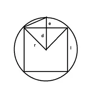 If denotes the length of a side of the square, draw a perpendicular line d from the center of the circle to side l. Let e denotes r  d. Then from the diagram: